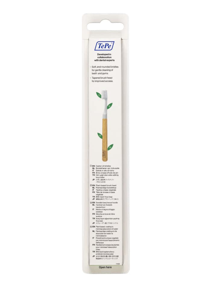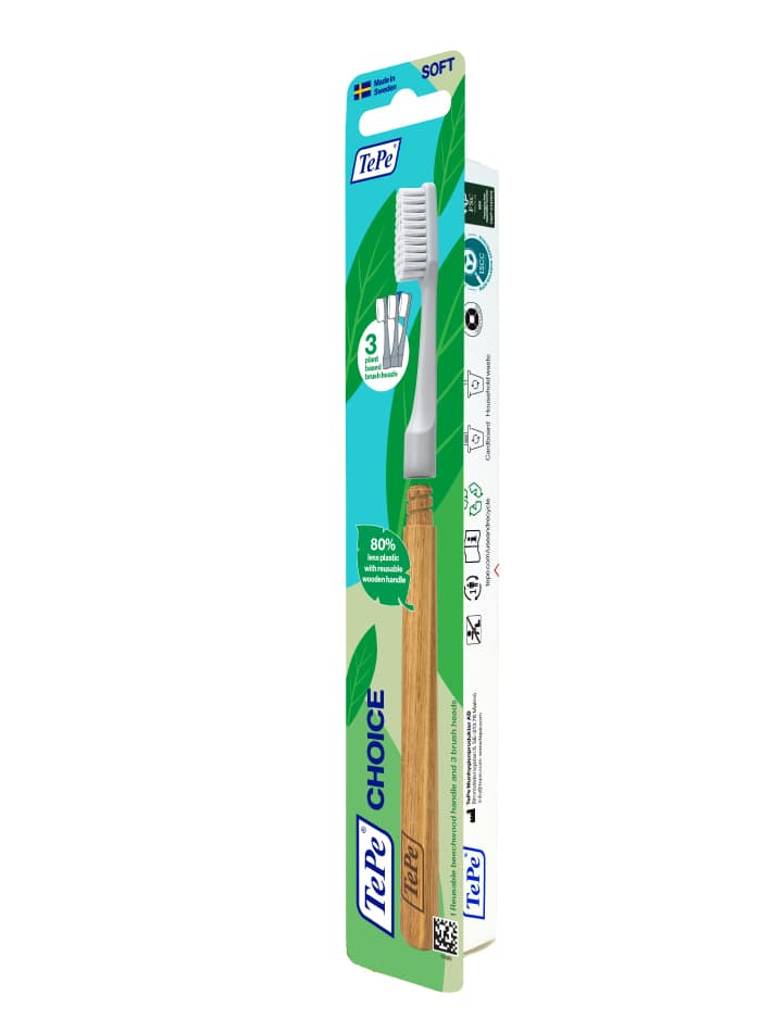 La brosse à dents TePe Choice™ est une brosse à dents à poils souples dotée d’un manche en bois réutilisable et de trois têtes de brosse échangeables. Fabriquée à partir de bois de hêtre cultivé en Suède et de matières premières certifiées renouvelables telles que l’huile de ricin. Les filaments souples arrondis permettent un nettoyage doux et efficace.