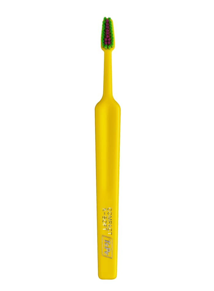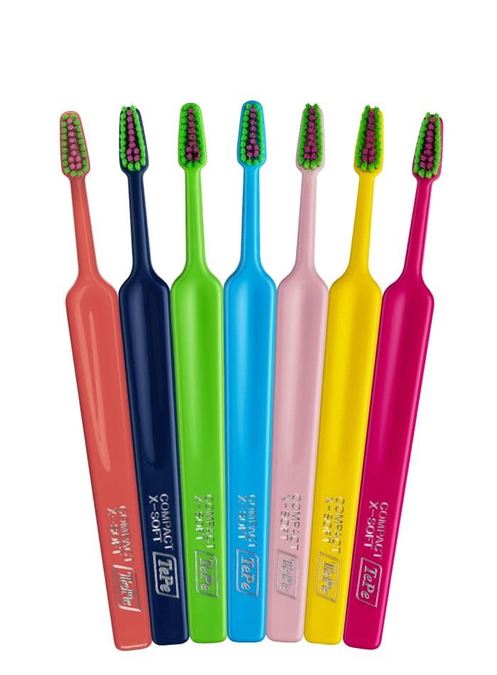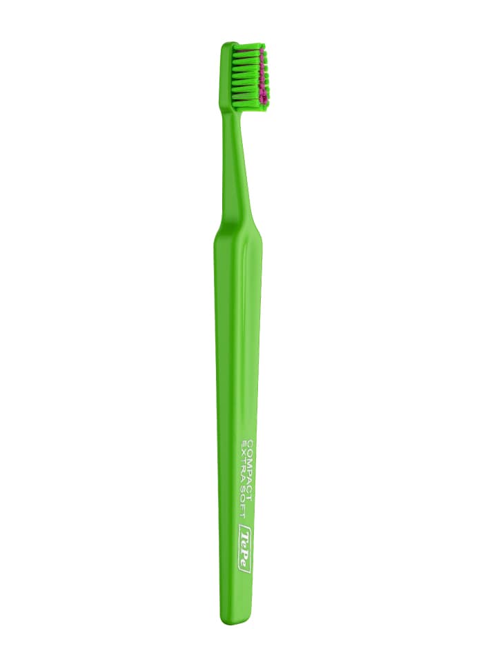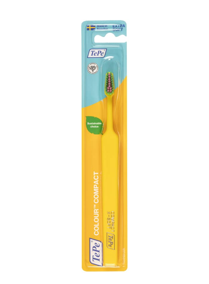 La brosse à dents TePe Colour Compact fait partie de la gamme Select. Des brosses à dents de haute qualité avec manche ergonomique, tête triangulaire pour un meilleur accès et des brins aux extrémités arrondies pour un nettoyage doux et efficace.