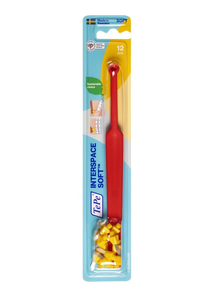 Disponible en deux souplesses (jaune : souple, bleu : médium), la brosse TePe Interspace combine efficacité et durabilité. En remplaçant les matières fossiles par des matières végétales grâce au procédé Mass Balance, son empreinte carbone a été réduite de près de 80 % sans compromettre la qualité, l’efficacité ou le design du produit.