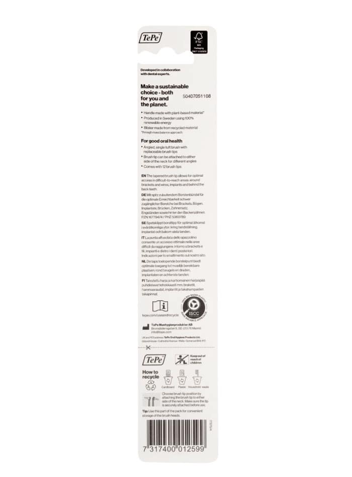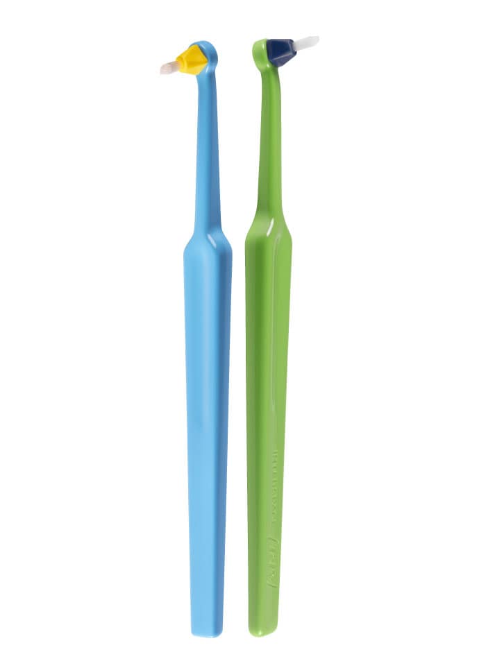La brosse à dents TePe Interspace est une brosse mono-touffe conçue pour atteindre facilement les zones difficiles, comme la surface distale des molaires, les furcations, les implants ou la dernière dent. Elle garantit un nettoyage en douceur et efficace là où une brosse classique ne peut pas accéder.