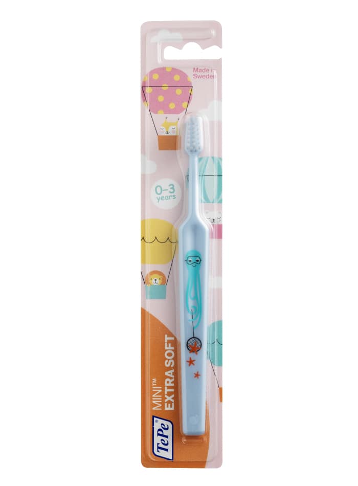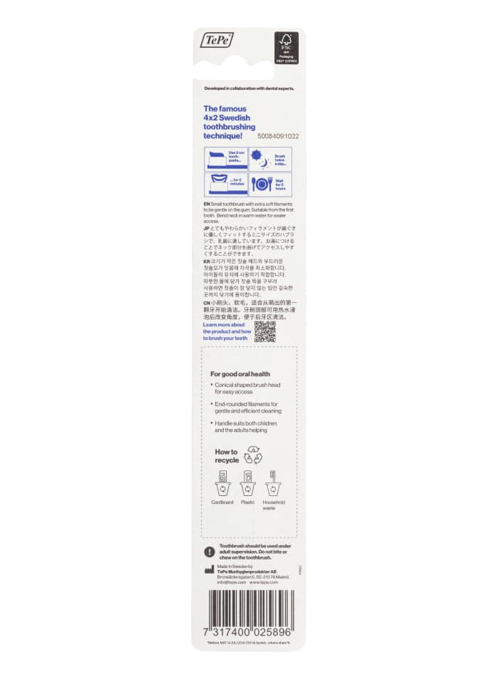 La brosse à dents TePe Mini fait partie de la gamme Select. Brosse de haute qualité avec un manche ergonomique, une petite tête conique pour un meilleur accès et des brins aux extrémités arrondies pour un nettoyage doux et efficace. La brosse à dents TePe Mini convient dès la première dent jusqu’à 3 ans.