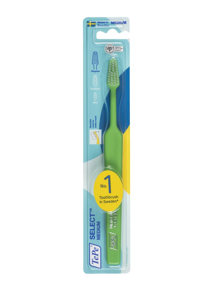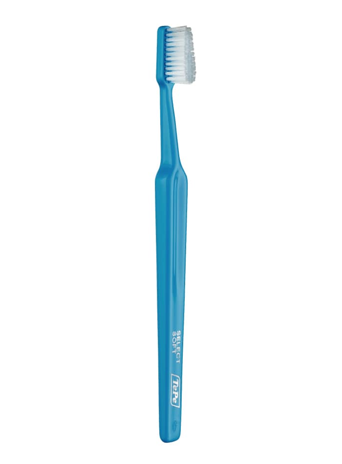 La brosse à dents TePe Select de haute qualité offre un manche ergonomique, une tête triangulaire pour un meilleur accès et des brins aux extrémités arrondies pour un nettoyage doux et efficace.