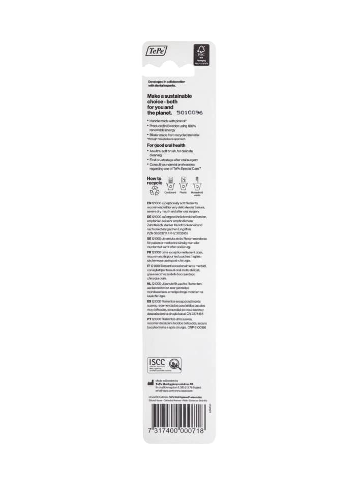 La brosse à dents TePe Special Care post chirurgicale est conçue pour les situations cliniques les plus délicates. Avec ses 12 000 brins ultra doux, elle est idéale pour les patients ayant subi une chirurgie buccale, un traumatisme, ou un traitement de radiothérapie. Elle permet un nettoyage extrêmement doux des dents et des gencives sans agresser les tissus sensibles.