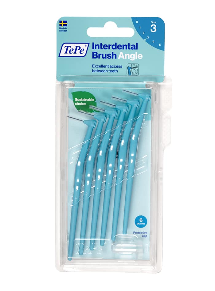 Les brossettes interdentaires TePe sont conçues pour nettoyer les espaces entre les dents inaccessibles avec une brosse à dents classique. En usage quotidien, elles permettent de garder des gencives et des dents saines. Les brossettes interdentaires permettent de nettoyer efficacement entre les dents, les implants, les couronnes et les bridges. Elles conviennent également pour le nettoyage des bagues et du fil pendant le traitement d’orthodontie. La brossette TePe Angle est disponible en 6 tailles, identifiées par un code couleur, pour s’adapter aux espaces interdentaires étroits ou larges – tailles ISO 0-5. Elle est dotée d’un long manche et d’une tête de brosse coudée pour faciliter l’accès aux dents postérieures. Les brossettes sont développées en collaboration avec des experts dentaires afin de garantir une qualité optimale dans les moindres détails. Un usage quotidien de la brossette interdentaire peut aider à éliminer jusqu’à 40 % de plaque supplémentaire par rapport au seul brossage des dents. L’élimination efficace de la plaque dentaire contribue à la prévention de l’inflammation des gencives, des caries et de la mauvaise haleine. En remplaçant les matières premières fossiles par des matières renouvelables intégrant le nouveau mode de production Mass Balance, nous avons réduit de manière significative l’empreinte carbone de cette brossette sans compromettre la qualité, l’efficacité ou le design du produit.