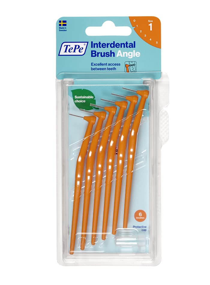 Les brossettes interdentaires TePe sont conçues pour nettoyer les espaces entre les dents inaccessibles avec une brosse à dents classique. En usage quotidien, elles permettent de garder des gencives et des dents saines. Les brossettes interdentaires permettent de nettoyer efficacement entre les dents, les implants, les couronnes et les bridges. Elles conviennent également pour le nettoyage des bagues et du fil pendant le traitement d’orthodontie. La brossette TePe Angle est disponible en 6 tailles, identifiées par un code couleur, pour s’adapter aux espaces interdentaires étroits ou larges – tailles ISO 0-5. Elle est dotée d’un long manche et d’une tête de brosse coudée pour faciliter l’accès aux dents postérieures. Les brossettes sont développées en collaboration avec des experts dentaires afin de garantir une qualité optimale dans les moindres détails. Un usage quotidien de la brossette interdentaire peut aider à éliminer jusqu’à 40 % de plaque supplémentaire par rapport au seul brossage des dents. L’élimination efficace de la plaque dentaire contribue à la prévention de l’inflammation des gencives, des caries et de la mauvaise haleine. En remplaçant les matières premières fossiles par des matières renouvelables intégrant le nouveau mode de production Mass Balance, nous avons réduit de manière significative l’empreinte carbone de cette brossette sans compromettre la qualité, l’efficacité ou le design du produit.