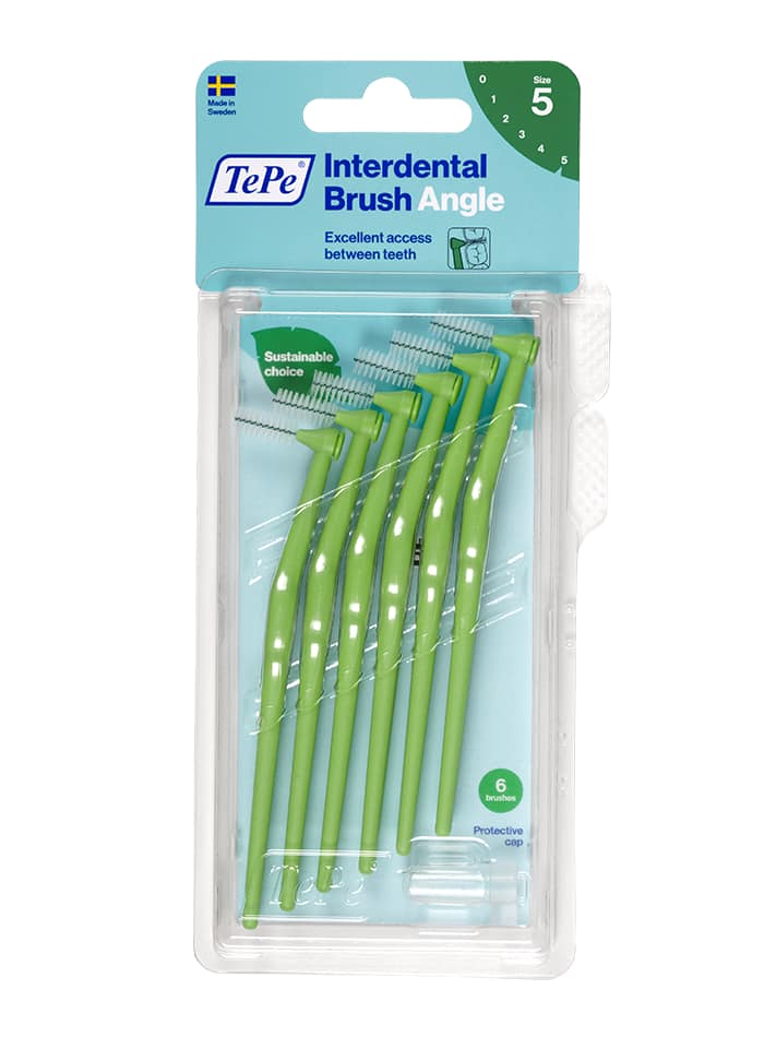 Les brossettes interdentaires TePe sont conçues pour nettoyer les espaces entre les dents inaccessibles avec une brosse à dents classique. En usage quotidien, elles permettent de garder des gencives et des dents saines. Les brossettes interdentaires permettent de nettoyer efficacement entre les dents, les implants, les couronnes et les bridges. Elles conviennent également pour le nettoyage des bagues et du fil pendant le traitement d’orthodontie. La brossette TePe Angle est disponible en 6 tailles, identifiées par un code couleur, pour s’adapter aux espaces interdentaires étroits ou larges – tailles ISO 0-5. Elle est dotée d’un long manche et d’une tête de brosse coudée pour faciliter l’accès aux dents postérieures. Les brossettes sont développées en collaboration avec des experts dentaires afin de garantir une qualité optimale dans les moindres détails. Un usage quotidien de la brossette interdentaire peut aider à éliminer jusqu’à 40 % de plaque supplémentaire par rapport au seul brossage des dents. L’élimination efficace de la plaque dentaire contribue à la prévention de l’inflammation des gencives, des caries et de la mauvaise haleine. En remplaçant les matières premières fossiles par des matières renouvelables intégrant le nouveau mode de production Mass Balance, nous avons réduit de manière significative l’empreinte carbone de cette brossette sans compromettre la qualité, l’efficacité ou le design du produit.