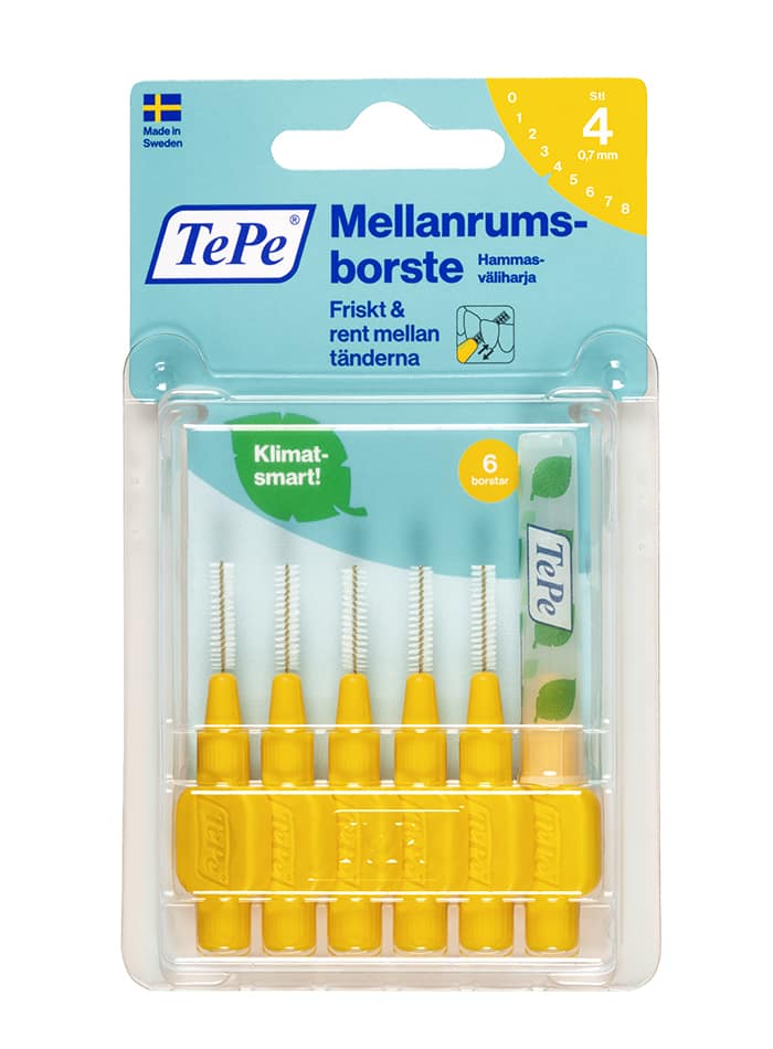 Les brossettes interdentaires TePe sont conçues pour nettoyer les espaces entre les dents inaccessibles avec une brosse à dents classique. En usage quotidien, elles permettent de garder des gencives et des dents saines. La brossette interdentaire peut être utilisée pour nettoyer les espaces entre les dents, les implants, les couronnes et les bridges. Elle est également adaptée au nettoyage des braquettes et du fil en orthodontie. La brossette interdentaire TePe Originale est disponible en 9 tailles codées par couleur afin de couvrir entièrement les variétés d’espaces interdentaires – tailles ISO 0-8. Les brossettes interdentaires sont développées en collaboration avec des experts dentaires pour en garantir la qualité optimale. Son utilisation quotidienne peut aider à éliminer jusqu’à 40 % de plaque supplémentaire à un simple le brossage des dents. L’élimination efficace de la plaque dentaire prévient l’inflammation des gencives, les caries et la mauvaise haleine. En remplaçant les matières premières fossiles par des matières végétales certifiées via l’approche du bilan de masse, nous avons réduit l’empreinte carbone de la brossette interdentaire d’environ 80 %, sans compromettre la qualité, l’efficacité ou la conception du dispositif.