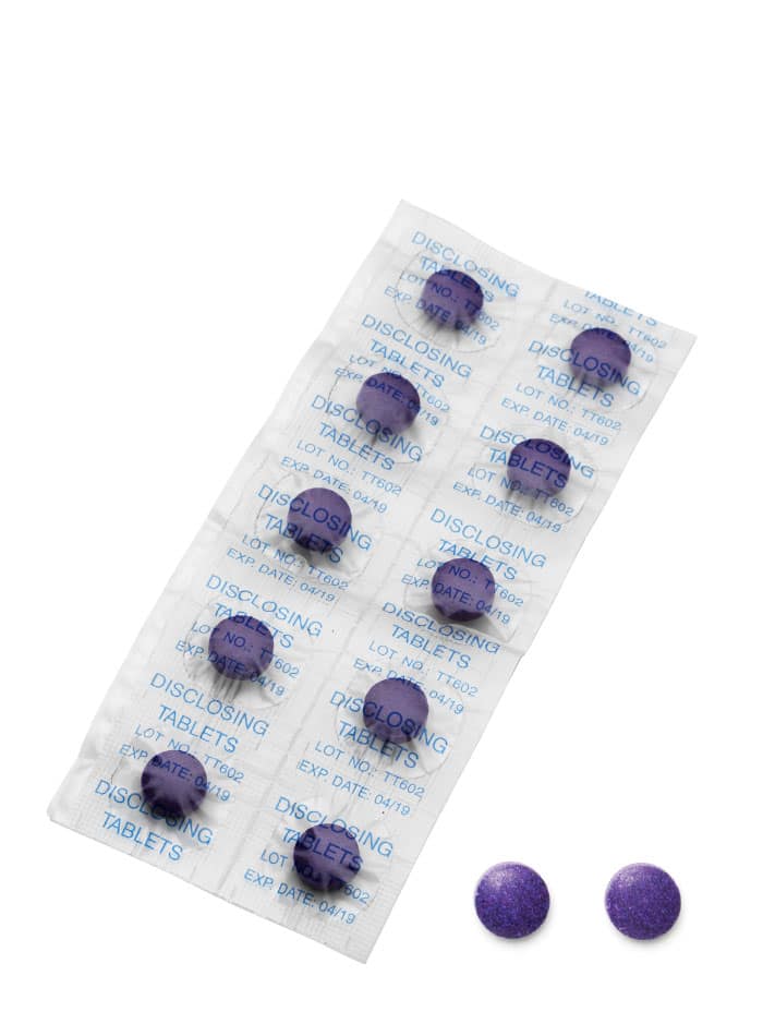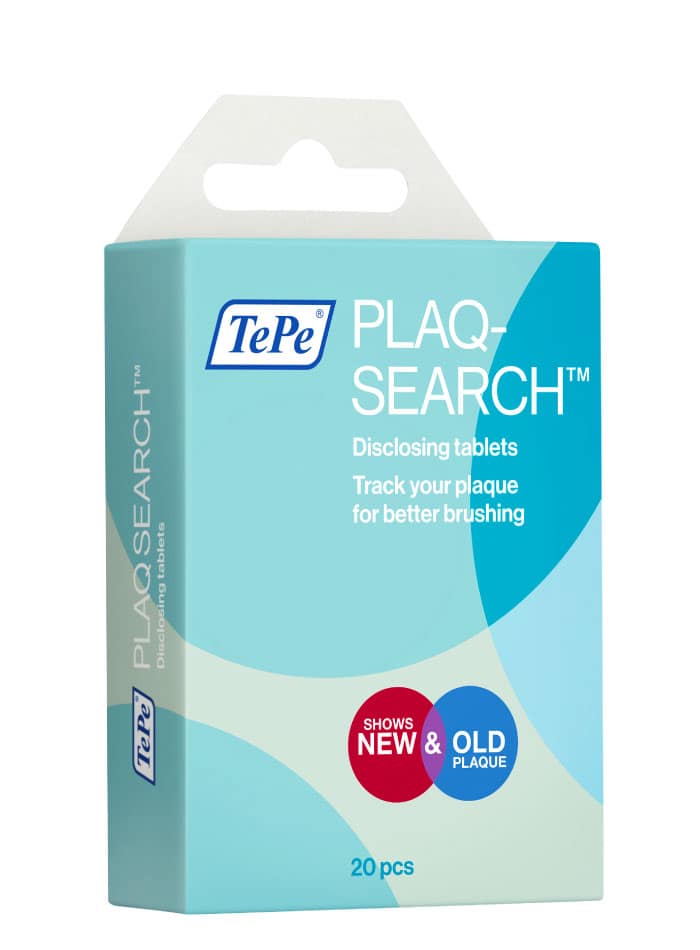TePe PlaqSearch se présente sous forme de pastilles à mâcher bicolores permettant de révéler efficacement la plaque dentaire. La pastille colore la nouvelle plaque en rouge et l’ancienne en bleu, offrant un contrôle clair et immédiat de l’hygiène bucco-dentaire.